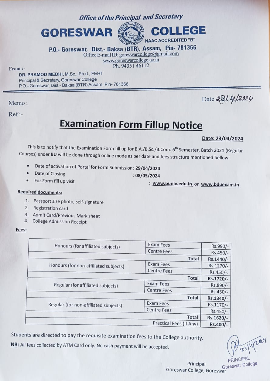 Notice on arear examination formfillup and fees structure under GU (regular 2022 batch)